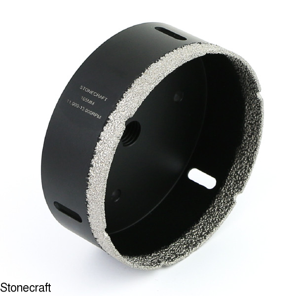 Алмазна коронка d 105 мм, різьблення М14, глибина свердління 35 мм. Висота алмазного напилення 10 мм. Для сверління керамограніту без води