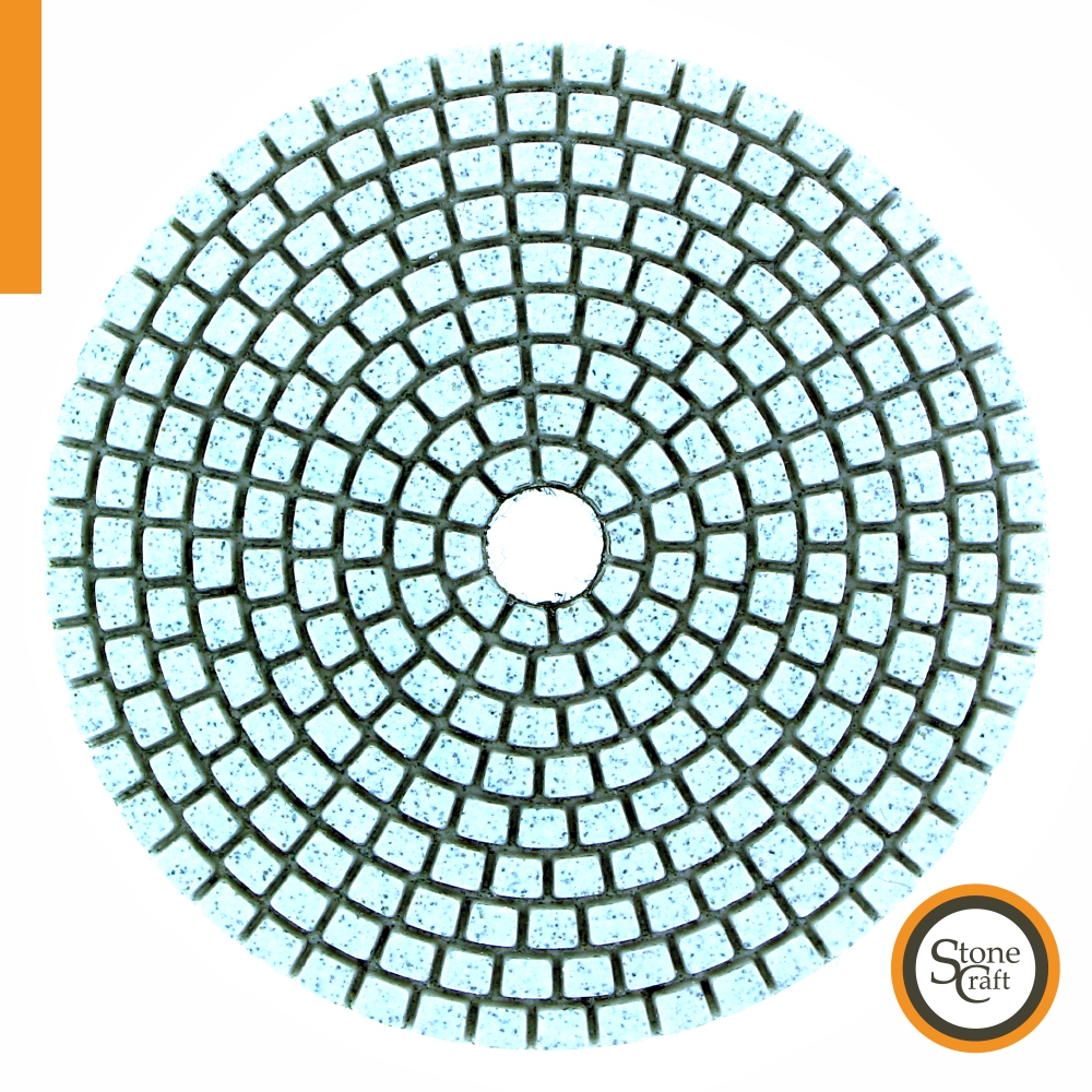 Універсальні алмазні гнучкі шліфувальні круги (липучки, черепашки) застосовуються для шліфування та полірування будь-яких виробів з граніту, мармуру, террацо, бетонних поверхонь і штучного каменю. Шліфувальний круг являє собою гнучку полімерну основу, яка містить кристали алмазу певного розміру. Система кріплення "Velcro" дозволяє швидко робити заміну круга. Рекомендується використовувати з професійною полировальною машинкою з центральним підведенням води STONECRAFT-100-1200RSD. Універсальні шліфкруги використовуються як для мокрого так і для сухого шліфування, проте використовуючи воду Ви збільшуєте термін експлуатації круга. Такі матеріали як габро та штучний камінь ми рекомендуємо полірувати з використанням води. При поліруванні стежте за тим, щоб не перегрівати круг. Рекомендовані обороти від 3000 до 1000 об / хв (чим вище номер, тим нижче обороти). Якщо Ви додаєте воду під час полірування, то кількість води має поступово знижуватися при переході на більш високий номер.