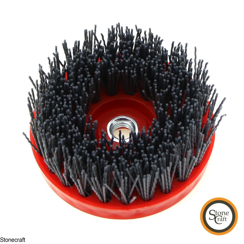 Спеціальні щітки з капронових волокном, що містить абразив - карбід кремнію. Застосовуються для механічної обробки каменю "під античність" d 110 mm, з використанням водяного охолодження. Різьблення М14, пласка поверхня з боку кріплення. Номер 1200